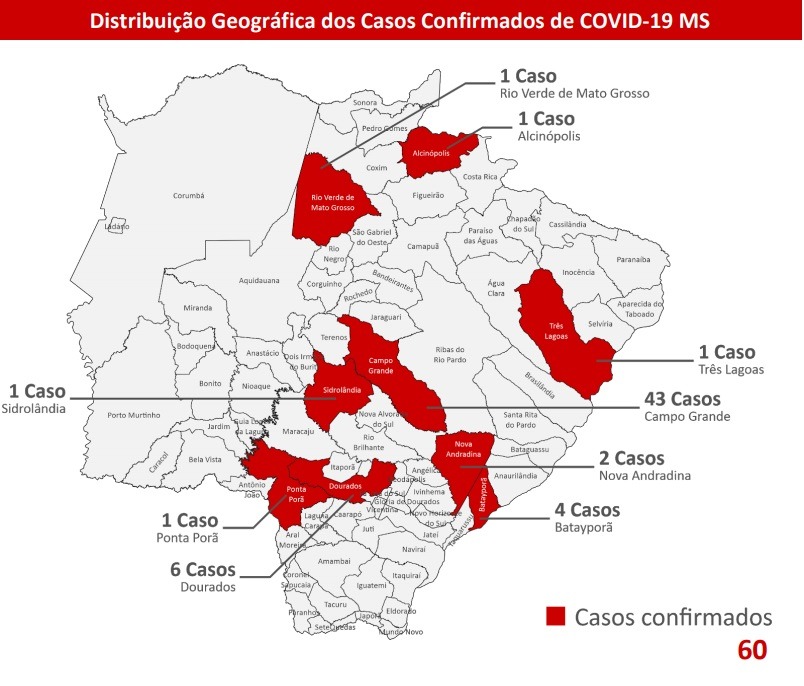 MATO GROSSO DO SUL – O Estado somou mais sete casos confirmados do novo coronavírus, segundo boletim divulgado nesta sexta-feira (3). Com isso, a quantidade de infectados subiu para 60. Dos pacientes cujos exames deram positivo, dois estão em Dourados e cinco na Capital e quatro estão internados.