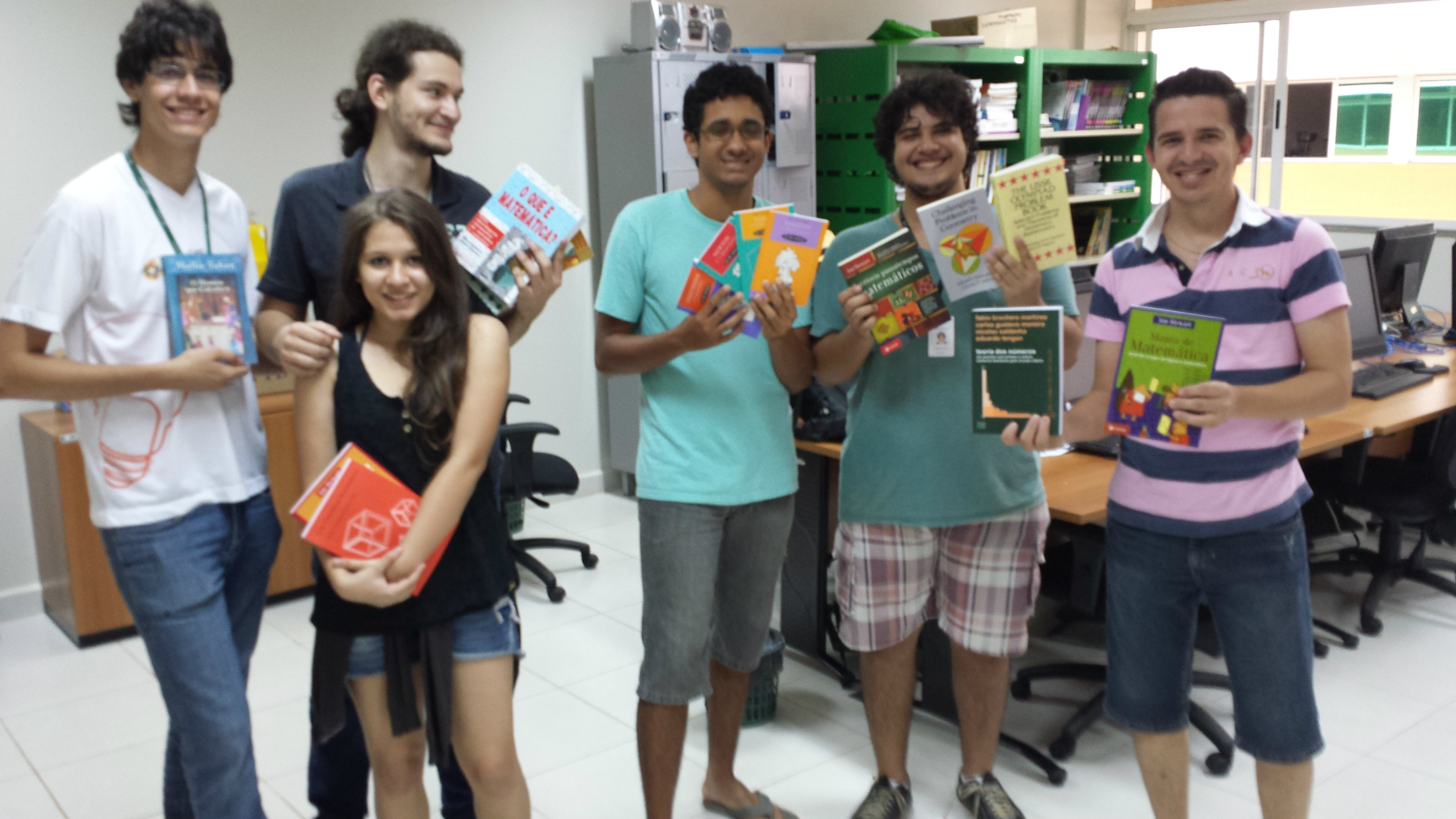 Na imagem, os integrantes do clube Os Fermatianos, composto pelos estudantes Elias Moraes, Gabriele Camargo, Samuel Sarmento, Pedro Bitencourt, João Flores e o professor mestre Joel Becker recebendo o prêmio da Obmep pela classificação na competição: Uma série de livros fantásticos sobre matemática. O grupo ficou empolgadíssimo e todos os volumes já foram levados para casa para serem “devorados”.
