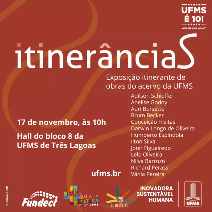 Até sexta-feira, 21, a população de Três Lagoas pode conhecer a exposição Itinerâncias, que integra as celebrações pelos 46 anos de Federal. Com entrada gratuita e aberta à toda a comunidade, a mostra reúne parte do acervo de artes plásticas da Instituição, composta por pinturas, esculturas e obras originais de autores sul-mato-grossenses.