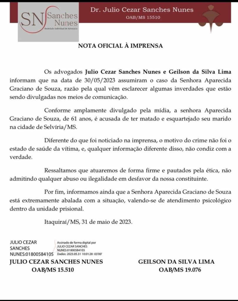 Em nota, a defesa da suspeita negou que o motivo do crime tenha sido o estado de saúde da vítima. Segundo os advogados, Aparecida está “extremamente abalada com a situação” e precisa de atendimento psicológico dentro da unidade prisional.