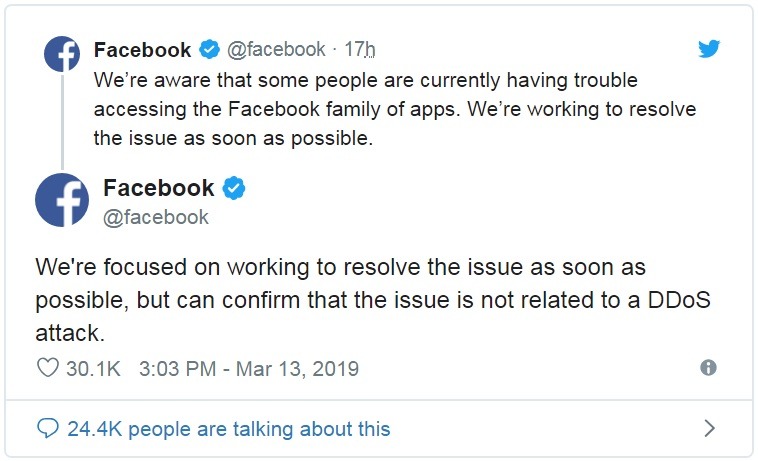 Após a volta dos serviços, a empresa não voltou a comentar o que causou o problema. Por volta das 16h da quarta-feira, em seu perfil no Twitter, o Facebook afirmou que estava “focado em resolver a questão” e que o problema não está relacionado a um ataque de negação de serviço (DDoS), que é um acesso coordenado, em massa, que visa derrubar um site.