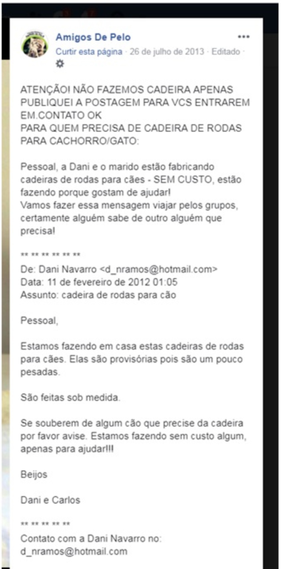 A postagem está circulando pelas mídias desde 2012. De acordo com a pessoa citada como a fabricante das cadeiras, Dani Navarro, ela não faz mais as fabricações devido a grande demanda e ainda relata que o post não foi feito por ela, mas por pessoas bem intencionadas e ligadas a causas dos animais.