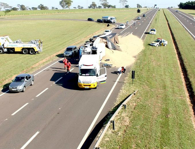 Em sua primeira viagem a serviço da empresa Transgrande, Silva não conseguiu efetuar o contorno na rotatória porque o reboque carregado com 37 t. de farelo de soja pendeu para um lado e tombou, espalhando o produto no local.