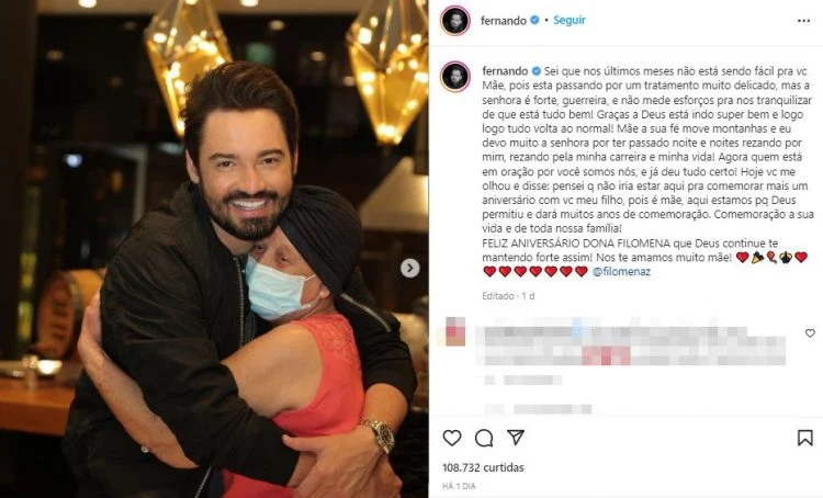 “Comemoração a sua vida e de toda nossa família! Feliz aniversário, dona Filomena, que Deus continue te mantendo forte assim! Nos te amamos muito mãe!”, completou Fernando.