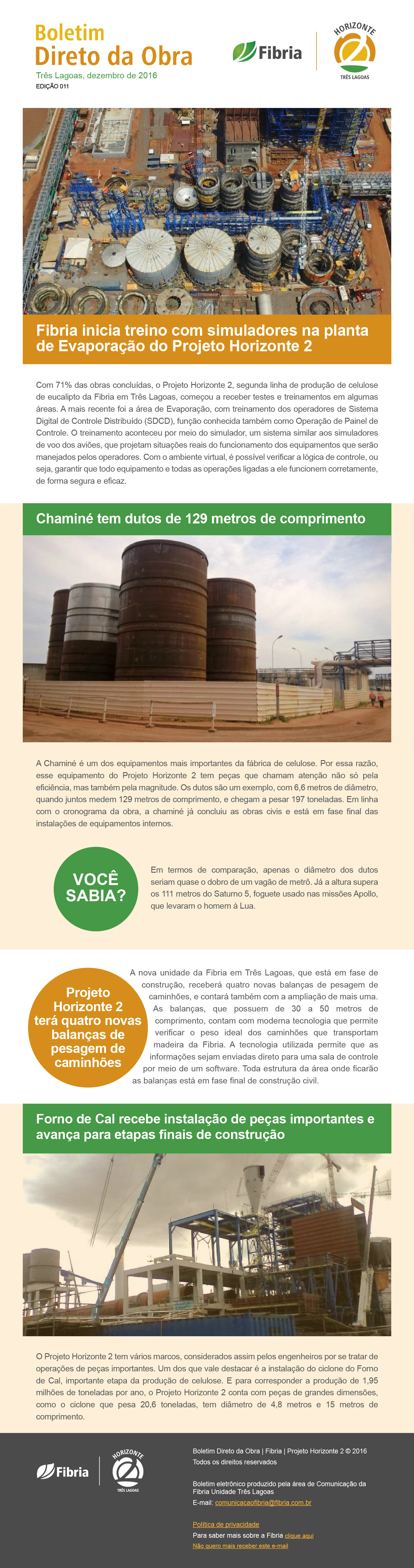 A Chaminé é um dos equipamentos mais importantes da fábrica de celulose. Por essa razão, esse equipamento do Projeto Horizonte 2 tem peças que chamam atenção não só pela eficiência, mas também pela magnitude. Os dutos são um exemplo, com 6,6 metros de diâmetro, quando juntos medem 129 metros de comprimento, e chegam a pesar 197 toneladas. Em linha com o cronograma da obra, a chaminé já concluiu as obras civis e está em fase final das instalações de equipamentos internos.