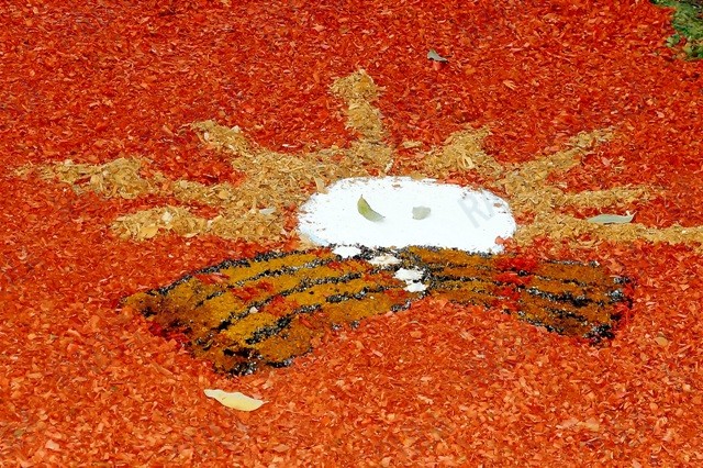 O feriado dessa quinta-feira (19) foi marcado pela tradicional montagem dos tapetes de pó de serragem em Três Lagoas.