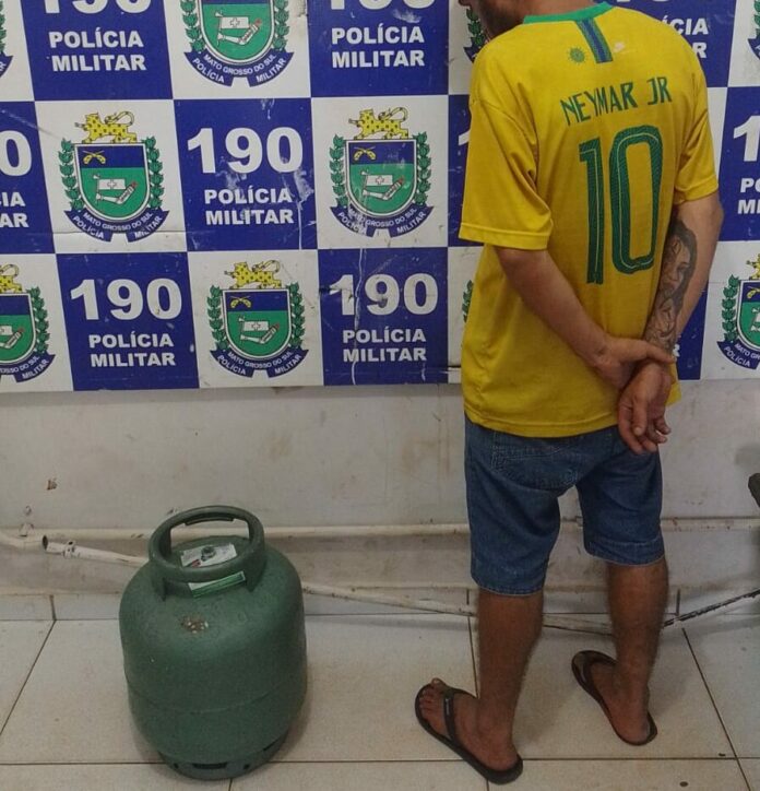 Em patrulhamento pela Rua Duque de Caxias, avistaram um homem com um botijão de gás de cozinha. Perguntado sobre o objeto, o rapaz de 21 anos afirmou ter pegado da casa de seu pai, que está separado de sua mãe, e que moram em residências diferentes, indo até a casa dele para praticar o furto.