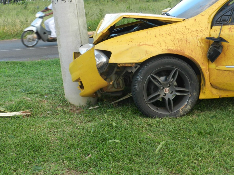 Com o impacto, a frente do carro ficou completamente destruída e um fio de alta tensão se rompeu.