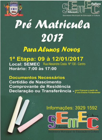 De 09/01/2017- 12/01/2017- 7h às 17h (sem interrupção) – Cadastramento dos novos alunos. Os pais ou responsáveis deverão comparecer a Secretaria Municipal de Educação e cultura, situada a Rua Alexandre Costa nº 130 com certidão de nascimento, comprovante de endereço e transferência ou declaração (este último somente para alunos do que irão estudar a partir do 2º ano do ensino fundamental) o cadastramento dos novos alunos (tanto de CEI como Ensino fundamental).