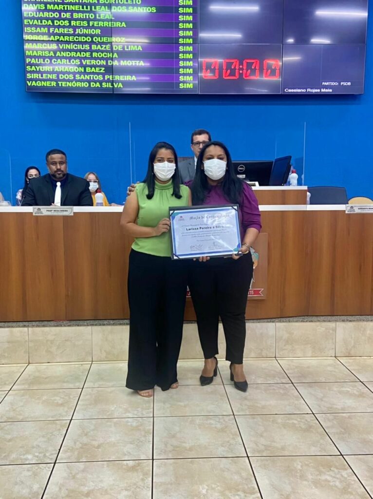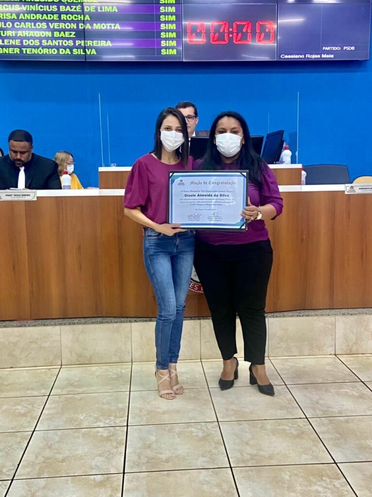 Três fisioterapeutas do Serviço de Atenção Domiciliar (SAD), da Secretaria Municipal de Saúde (SMS), receberam nesta segunda-feira (25), a Monção de Congratulação na Câmara Municipal da vereadora Sirlene dos Santos Pereira pelos trabalhos realizados com pacientes em tratamento pós-covid 19 grave.