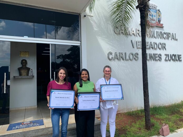Três fisioterapeutas do Serviço de Atenção Domiciliar (SAD), da Secretaria Municipal de Saúde (SMS), receberam nesta segunda-feira (25), a Monção de Congratulação na Câmara Municipal da vereadora Sirlene dos Santos Pereira pelos trabalhos realizados com pacientes em tratamento pós-covid 19 grave.