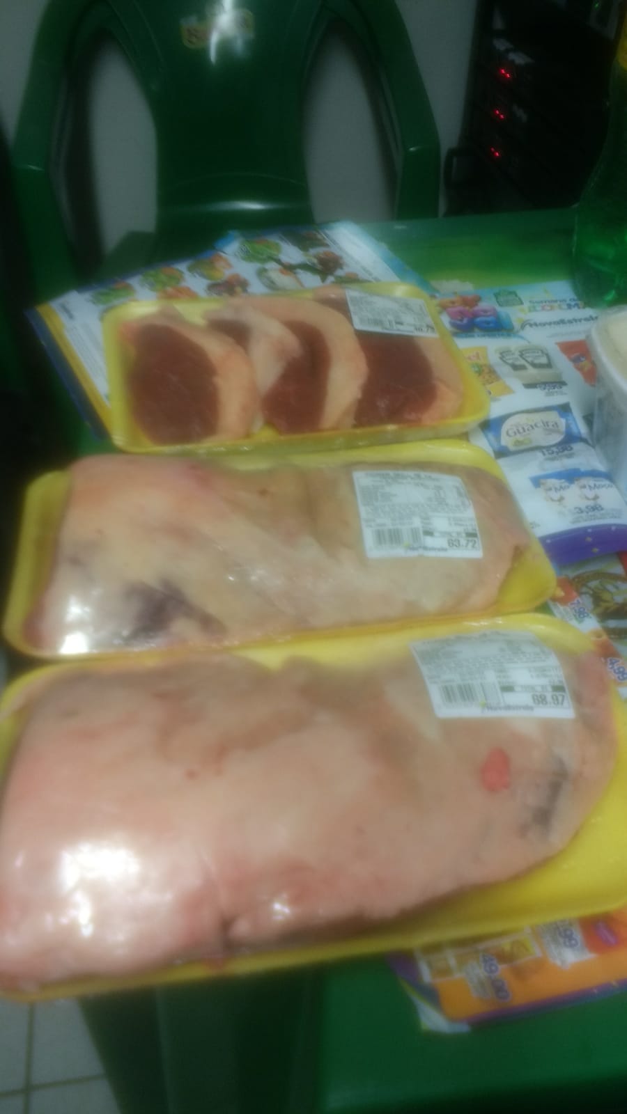 Em contato com o segurança da loja, observou pelas câmeras de segurança um homem adentrando a loja, indo direto ao açougue, escolhendo as peças de carne e passou pelos caixas sem efetuar o pagamento.