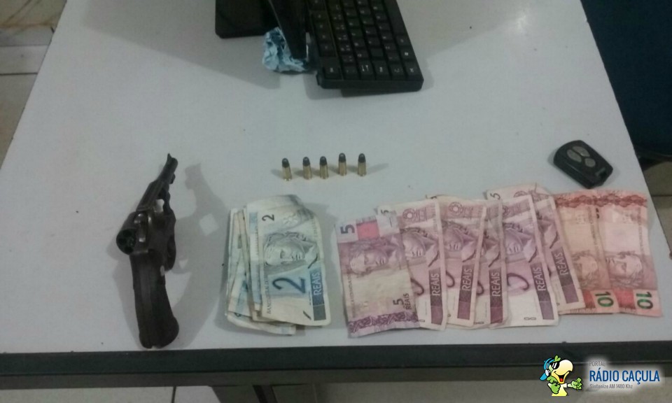 Após a abordagem um dos suspeitos atirou em um matagal um objeto após buscas foi feita a apreensão de dinheiro –conveniente do roubo- junto com os jovens e uma arma calibre 32 com cinco munições intactas a qual o autor do roubo a jogou.