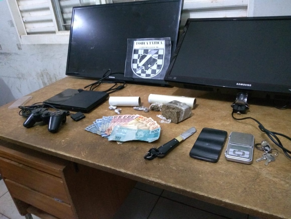 Foi realizada busca no imóvel e os policiais encontraram 213,5 g de maconha, balança de precisão, além do televisor furtado do hotel, um vídeo game e celular sem procedência.