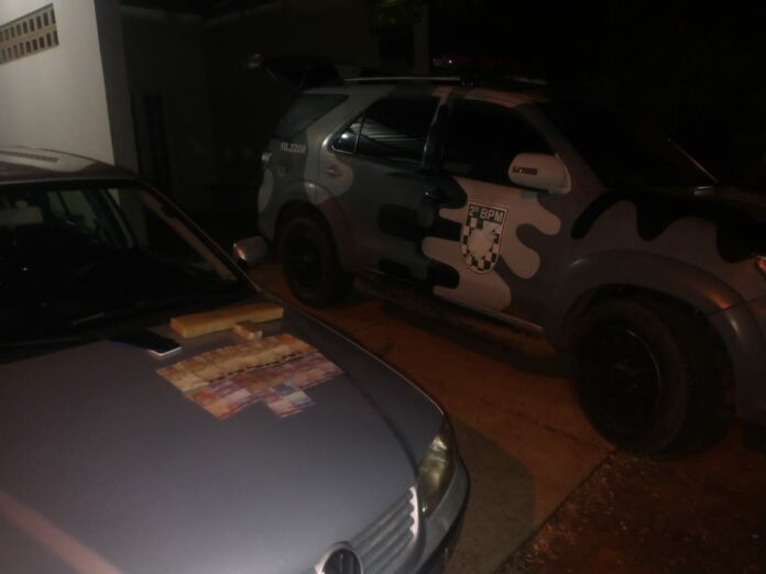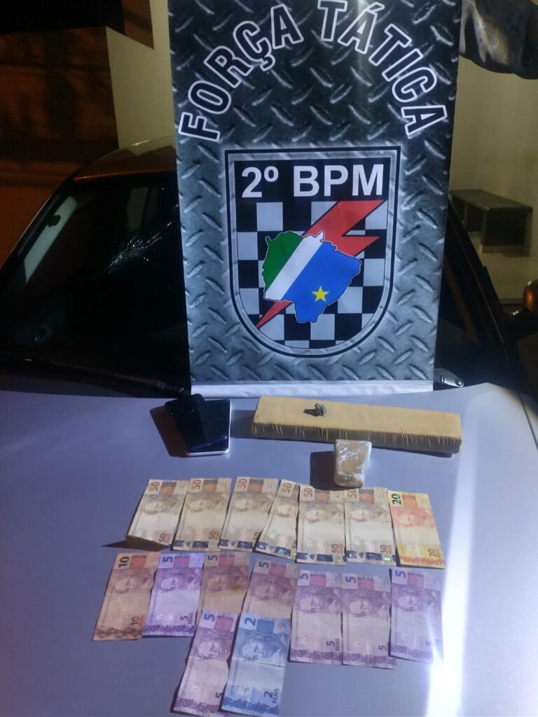 Com a suspeita, foi então realizada uma abordagem policial, onde em revista foi localizado no bolso de um rapaz de 26 anos um tablete de maconha, pesando 113gr, R$ 367, além de um celular Samsung branco. Já em revista ao condutor do veículo, de 39 anos foi localizado somente sua CNH, no carro foi localizado um tablete de maconha pesando 877gr e um aparelho Motorola azul.