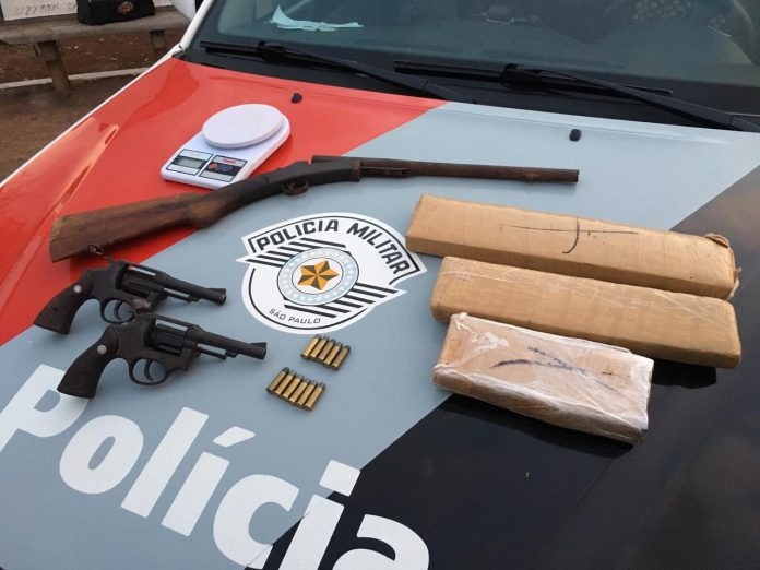 A Polícia Militar recebeu uma denúncia a respeito do material. O homem foi abordado na rua e negou possuir qualquer produto ilícito, mas admitiu ter uma pequena quantia de maconha. Em busca pelo imóvel foi encontrado uma bolsa com dois revolveres calibre 38, uma espingarda calibre 36, 15 munições calibre 38, uma balança e 2,704 kg de maconha, divididos em três tijolos.