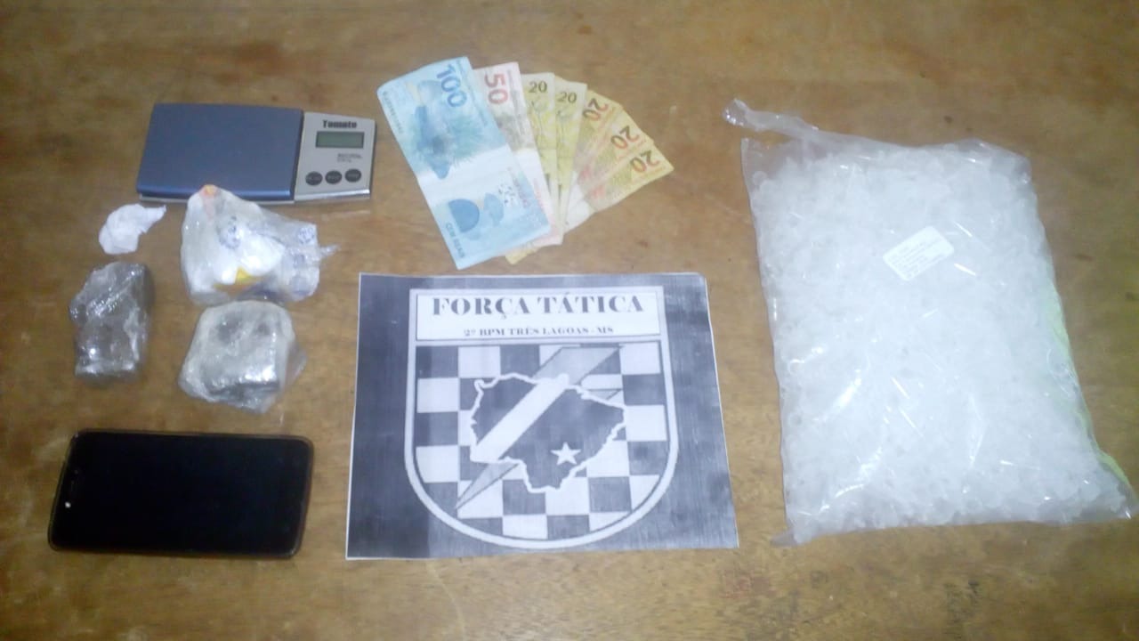 Ele estava com uma mulher em uma moto com placas de Três Lagoas, quando foi abordado pela guarnição no bairro Vila Piloto, em Três Lagoas (MS). Via sistema, os policiais constataram que o homem possuía um mandado de prisão em aberto. O suspeito ainda admitiu que em sua residência estavam 159 gramas de maconha e 157 gramas de cocaína, além de uma balança de precisão, R$ 250,00 em espécie e um saco com cerca de mil pinos vazios.