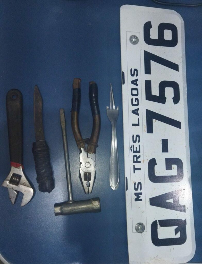 Ao deslocar até a residência do infrator, a prima do mesmo liberou a entrada da polícia e entregou uma mochila de cor preta com diversos itens, como: Alicate, garfo, faca, chave inglesa e uma placa.