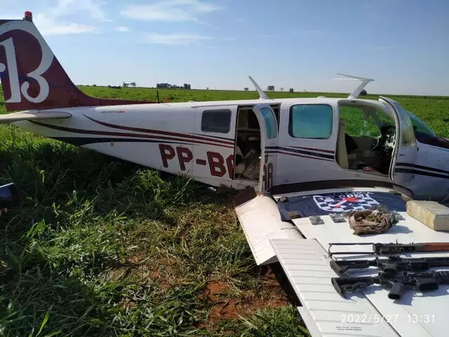 Ainda segundo a polícia, foram então acionadas as delegacias, para que os policiais fossem ao local, onde foi localizado o avião carregado com as drogas e armas. Logo após o pouso forçado, o piloto tentou se esconder na mata de uma propriedade rural.