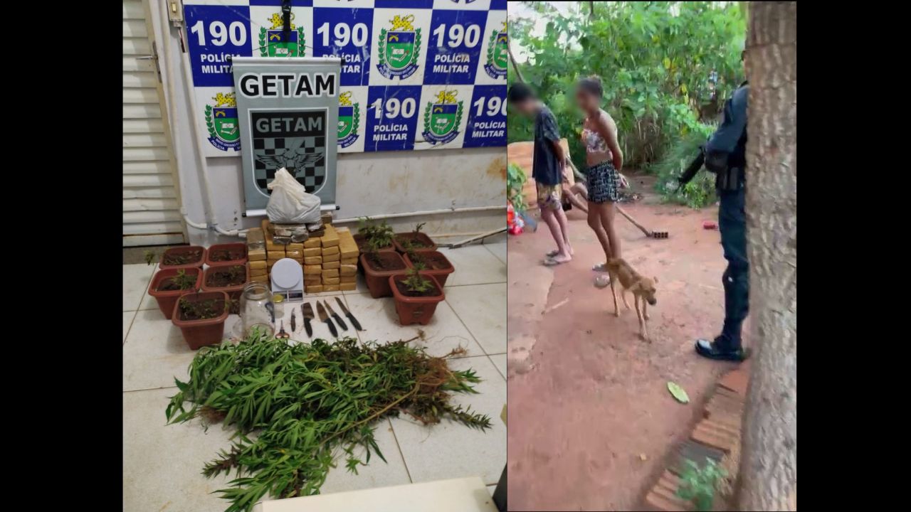 Em um terreno, os policiais encontraram uma plantação de cannabis, além de alguns tabletes de maconha.