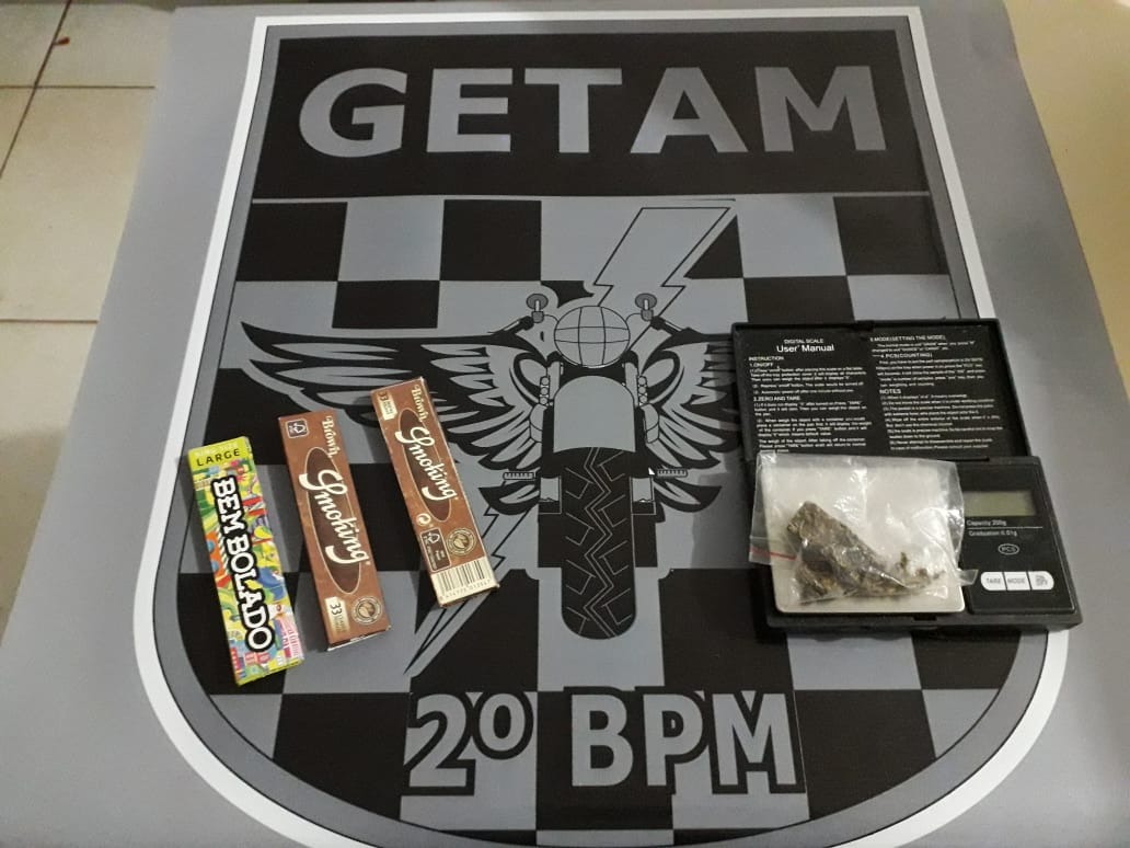 Quando os militares se aproximaram do grupo, logo perceberam um forte odor de maconha. De imediato foi realizada a abordagem Policial e durante a busca pessoal foi encontrada uma porção de maconha em um invólucro de plástico, que pesada totalizou 4,3g.
