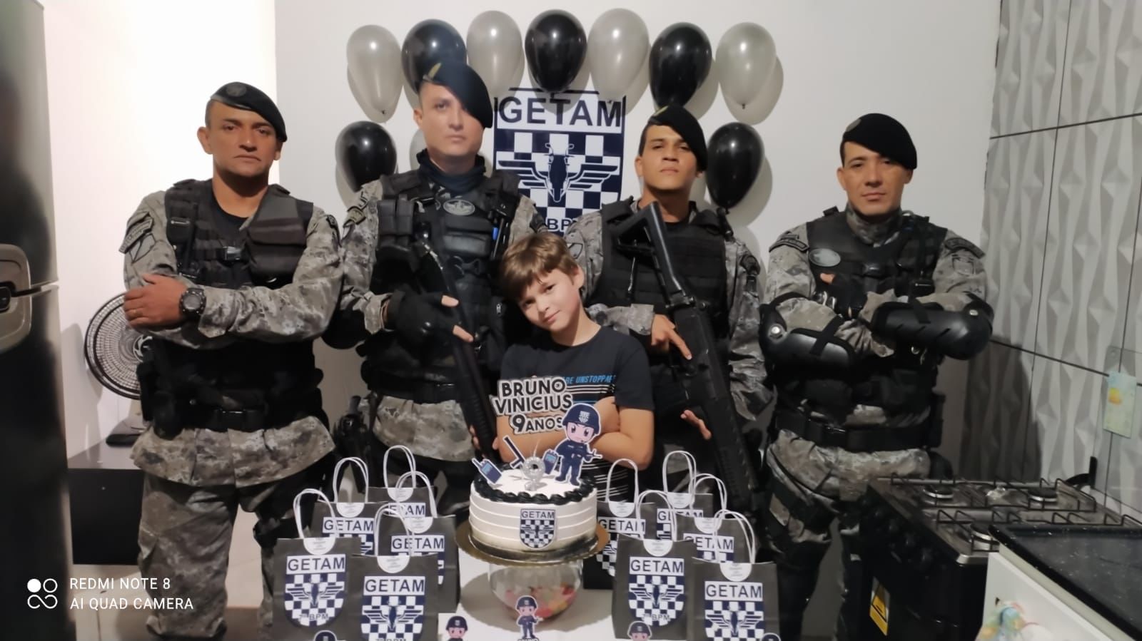 O menino Bruno Vinícius é morador do bairro Jupiá e foi neste bairro que comemorou o seu aniversário de nove anos, nesta última sexta-feira (13). A data sexta-feira 13 é repleta de superstições, onde muitos acreditam que a data significa azar. Porém, para o menino Bruno Vinícius foi um dia de muita sorte, uma vez que os seus heróis do Grupo Especial Tático de Motos (Getam) marcaram presença de surpresa na festa de aniversário.