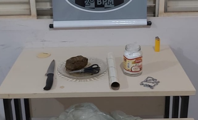 O homem se escondeu dentro de um cômodo de uma residência, onde os policiais também encontraram diversos apetrechos utilizados na preparação da droga para venda. Foram apreendidos tesoura, papel filme, prato, faca e um canivete.