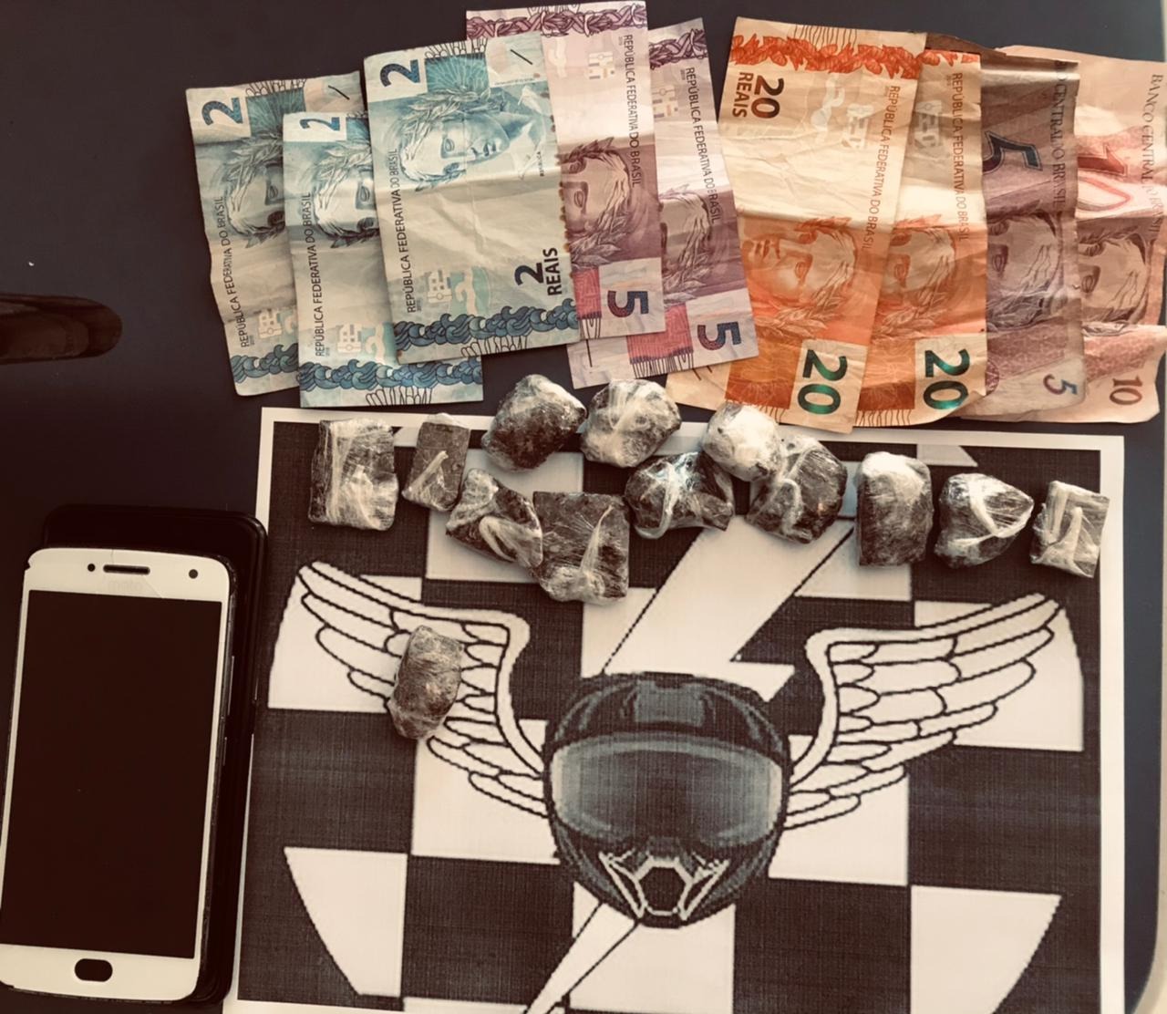 Ao realizar a busca no local onde a autora arremessou a sacola, foi encontrada no interior da mesma doze trouxinhas de maconha envoltas em plástico filme, iguais a encontrada com o autor. O homem ainda tinha a importância de R$37,00 com notas diversas, já a mulher levava R$34,00.