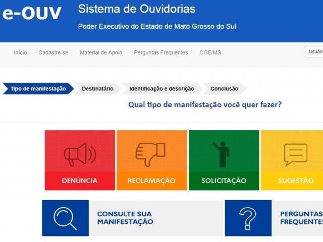O layout é bastante intuitivo. O endereço do serviço é www.ouvidorias.ms.gov.br. Há um banner para facilitar o acesso no site oficial do Governo.