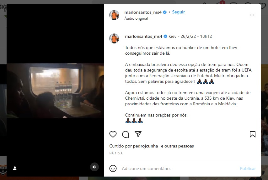 O caminho até o primeiro destino tem 535 quilômetros. “A embaixada brasileira deu essa opção de trem para nós. Quem deu toda a segurança de escolta até a estação de trem foi a UEFA (sigla da União Europeia de Futebol), junto com a Federação Ucraniana de Futebol. Muito obrigado a todos”, escreveu Marlon em seu perfil no Instagram.