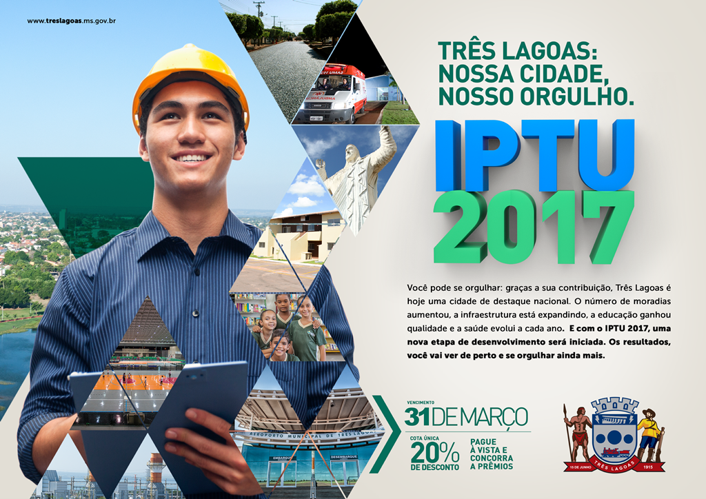 A primeira parcela do Imposto Predial e Territorial Urbano (IPTU) 2017, de Três Lagoas vence hoje. O pagamento total à vista possui um desconto de 20%, podendo ser efetuado em Casas Lotéricas, bancos ou convênios bancários até as 17h.