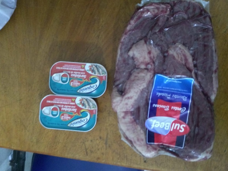 Com ele foi encontrado uma peça de picanha, pesando aproximadamente 1,5 kg e duas latas de sardinha. Com a chegada da PM ao local, o homem confessou não ter pago pelos produtos. Ele foi detido e encaminhado para Delegacia de Polícia.