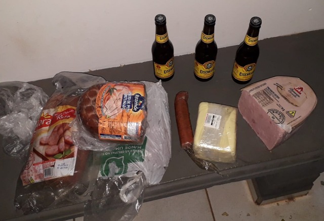 O homem ainda apontou para os policiais o local onde havia escondidos os produtos de furto. Os militares apreenderam uma escada, e os produtos de alimentos: Muçarela, calabresa, presunto cozido, peito de Peru defumado e 3 cervejas. O homem foi encaminhado para a Delegacia de Polícia para a tomada de providências cabíveis.