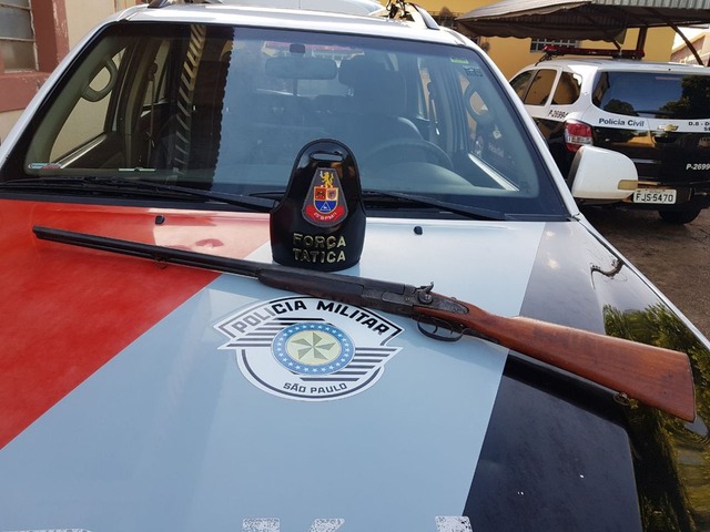 Ao abordá-lo, não foi encontrado nada ilícito, porém, no porta-malas do carro foi localizada uma espingarda de dois canos, calibre 32, sem marca aparente.