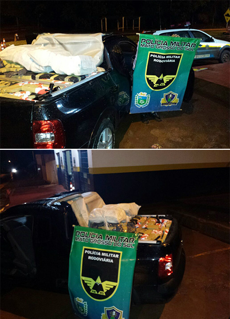 Após isso, ele logo foi alcançado por uma viatura. Durante a revista, a PM constatou que ele era de nacionalidade Paraguai, bem como a caçamba do carro estava lotada de maconha.