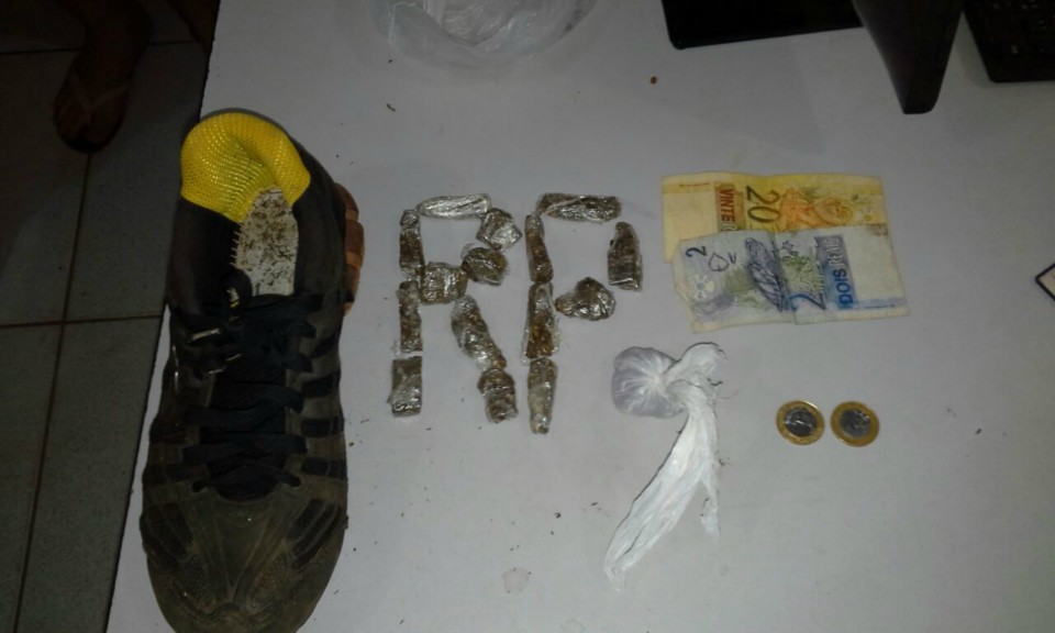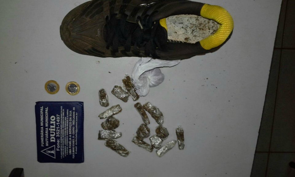 Os policiais se deslocaram até a residência do autor e lograram êxito em localizar no interior de um tênis na cor preta debaixo de uma mesa no quintal da residência junto ao muro, uma sacola com 16 porções de maconha prontas para o comercio, totalizando o peso de 50 gramas.