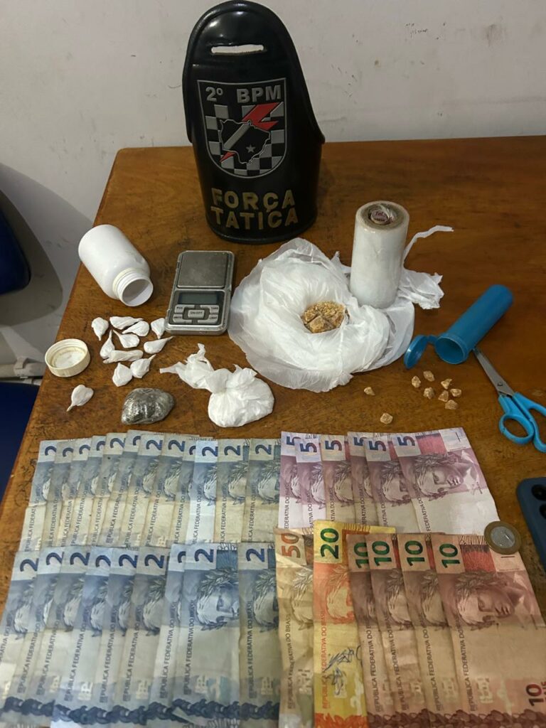 Durante a busca, o suspeito tentou esconder uma sacola verde, jogando-a para outro cômodo da casa. A sacola foi encontrada no banheiro da área de lazer e continha diversos itens relacionados ao tráfico: uma balança de precisão, tesoura, isqueiros, sacolas plásticas, 21,9 gramas de crack, 23,9 gramas de cocaína, 9,8 gramas de maconha e 11 papelotes de cocaína pesando 5,9 gramas.