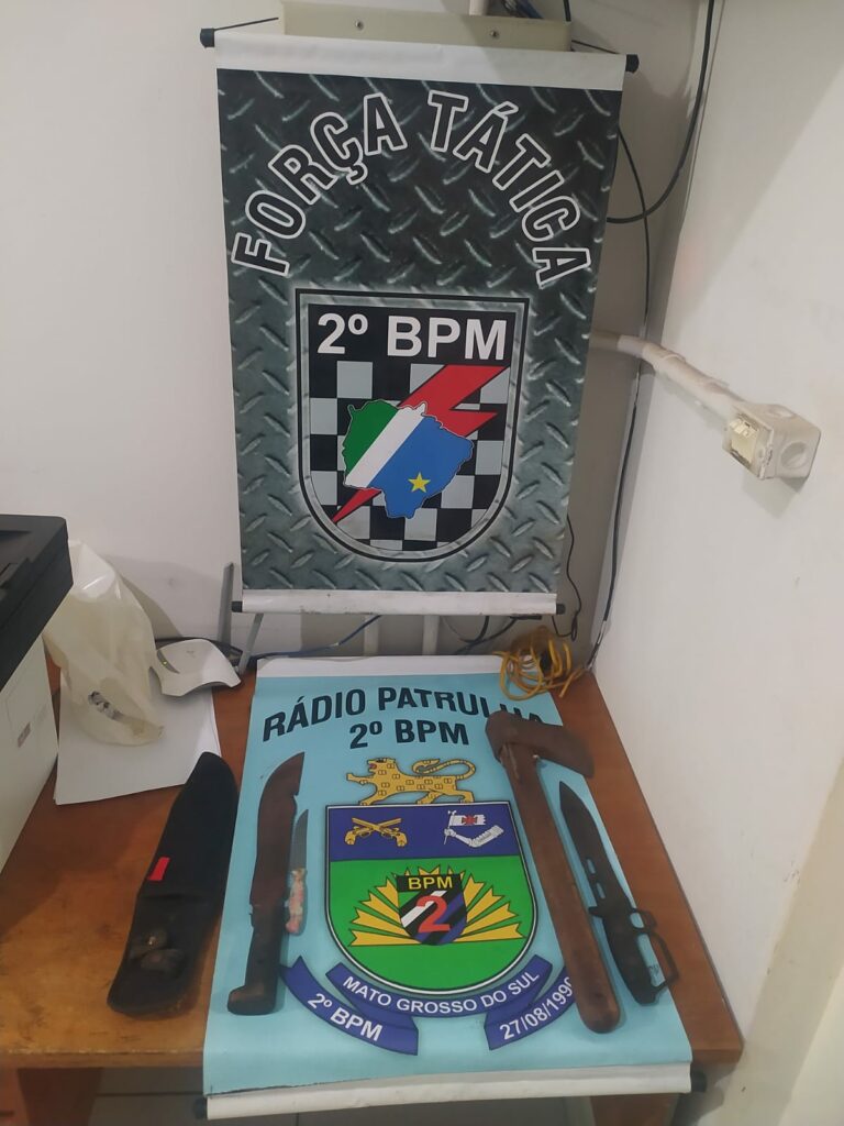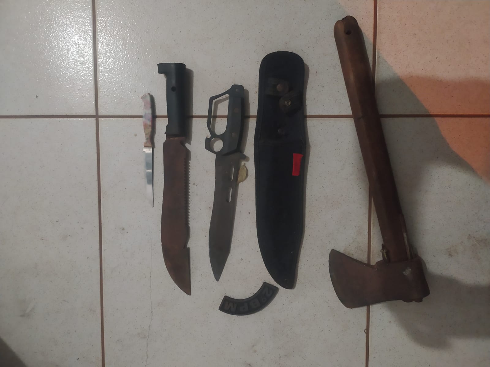 As equipes da Rádio Patrulha e da Força Tática, na madrugada desta quarta (28), acionados na rua do Fotógrafo no Jardim das Violetas, encontraram um homem bastante agressivo, e em posse de uma faca e um machado, muito transtornado.