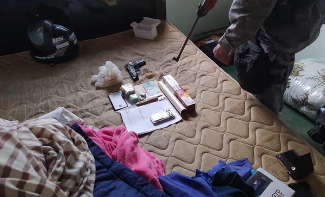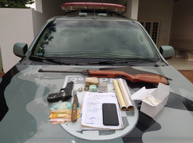 Em buscas realizadas no imóvel, a polícia localizou 51g cocaína, 196g maconha, apetrechos para o embalo, uma balança de precisão, uma espingarda de pressão, um simulacro de pistola, além de R$ 910,00 em dinheiro.