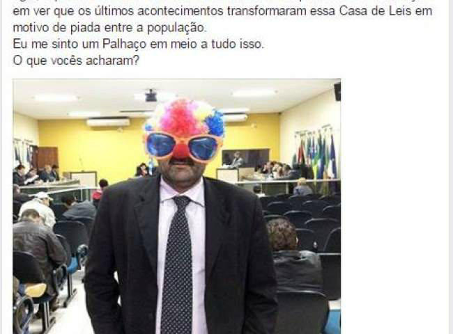 Empresário conhecido na cidade, o homem vestido de palhaço postou no Facebook uma foto da visita à Câmara. “Hoje fui assistir a sessão da Câmara de Vereadores de Amambai vestido a rigor, representando os vereadores e ao mesmo tempo a minha insatisfação em ver que os últimos acontecimentos transformaram essa Casa de Leis em motivo de piada entre a população. Eu me sinto um Palhaço em meio a tudo isso”, publicou.
