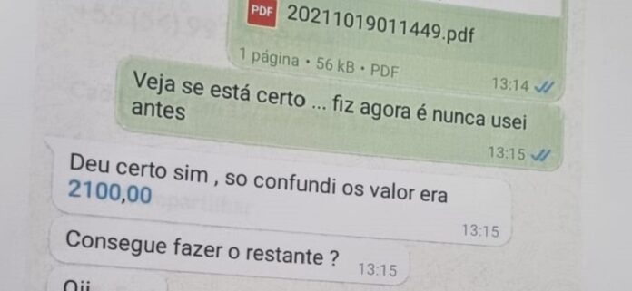 Nas mensagens, o estelionatário alegou que precisava de R$ 1.680,99 para pagar a parcela de um consórcio que estava vencendo, e sem desconfiar de que se tratava de um golpe, foi pessoalmente até uma Casa Lotérica e sacou o dinheiro em espécie, depositando o valor para uma mulher, com conta na Caixa Econômica Federal.
