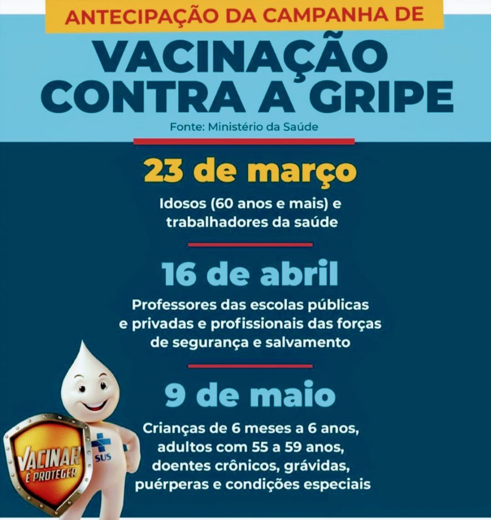TRÊS LAGOAS (MS) – A Secretaria Municipal de Saúde (SMS) de Três Lagoas, por meio do Setor de Imunização, informa à população que a Campanha Nacional de Vacinação contra Influenza começa na segunda-feira (23), em todas as 16 Unidades de Atenção Primária de Saúde, ou seja, nas Unidades de Saúde da Família (USF) e Unidades Básicas de Saúde (UBS).