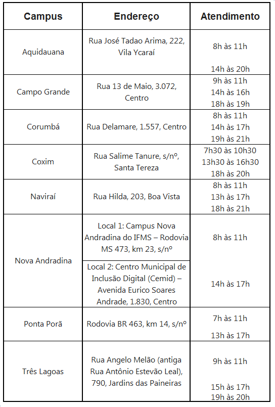 Matrículas – Devem ser realizadas na Central de Relacionamento (Cerel) dos campi do IFMS, na segunda e terça-feira, 20 e 21 fevereiro, nos endereços e horários disponíveis no edital da segunda chamada.