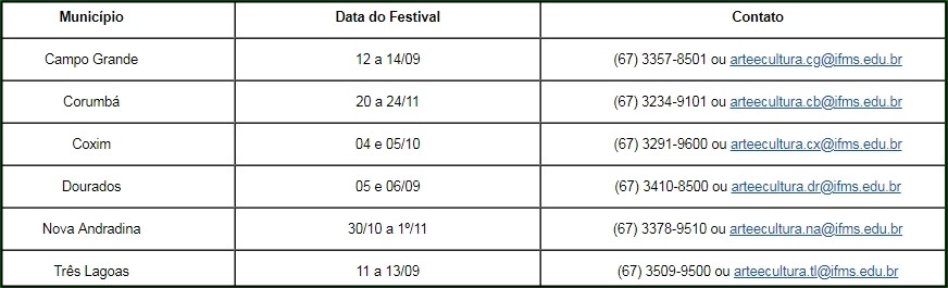 Durante o Festival, a sede local do campus do IFMS (Rua Ângelo Melão, 790, Jardim das Paineiras) será palco de oficinas de dança, fotografia e regência de coral.