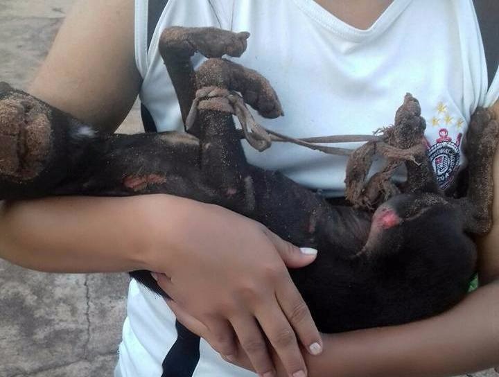 As imagens de uma cadela com marcas de queimadura pelo corpo e com as quatro patas amarradas despertou a revolta e indignação dos internautas três-lagoenses nesta sexta-feira (24). O animal foi multilado e abandonado em um terreno na Rua Visconde de Tamandaré, bairro Vila Nova.