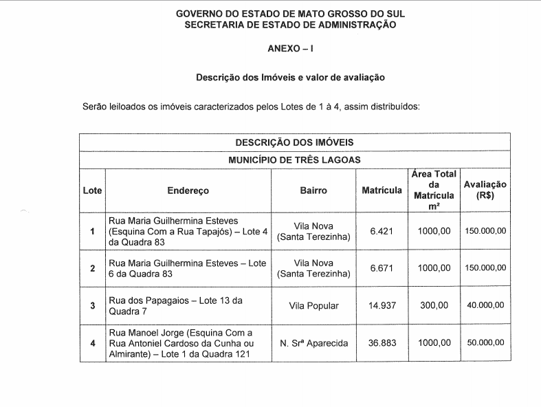 Quatro imóveis localizados na cidade de Três Lagoas serão leiloados pelo Governo de Mato Grosso do Sul nesta sexta-feira (04). O leilão será em forma de pregão, que acontecerá às 09h na Câmara Municipal da cidade, conforme foi publicado no edital.