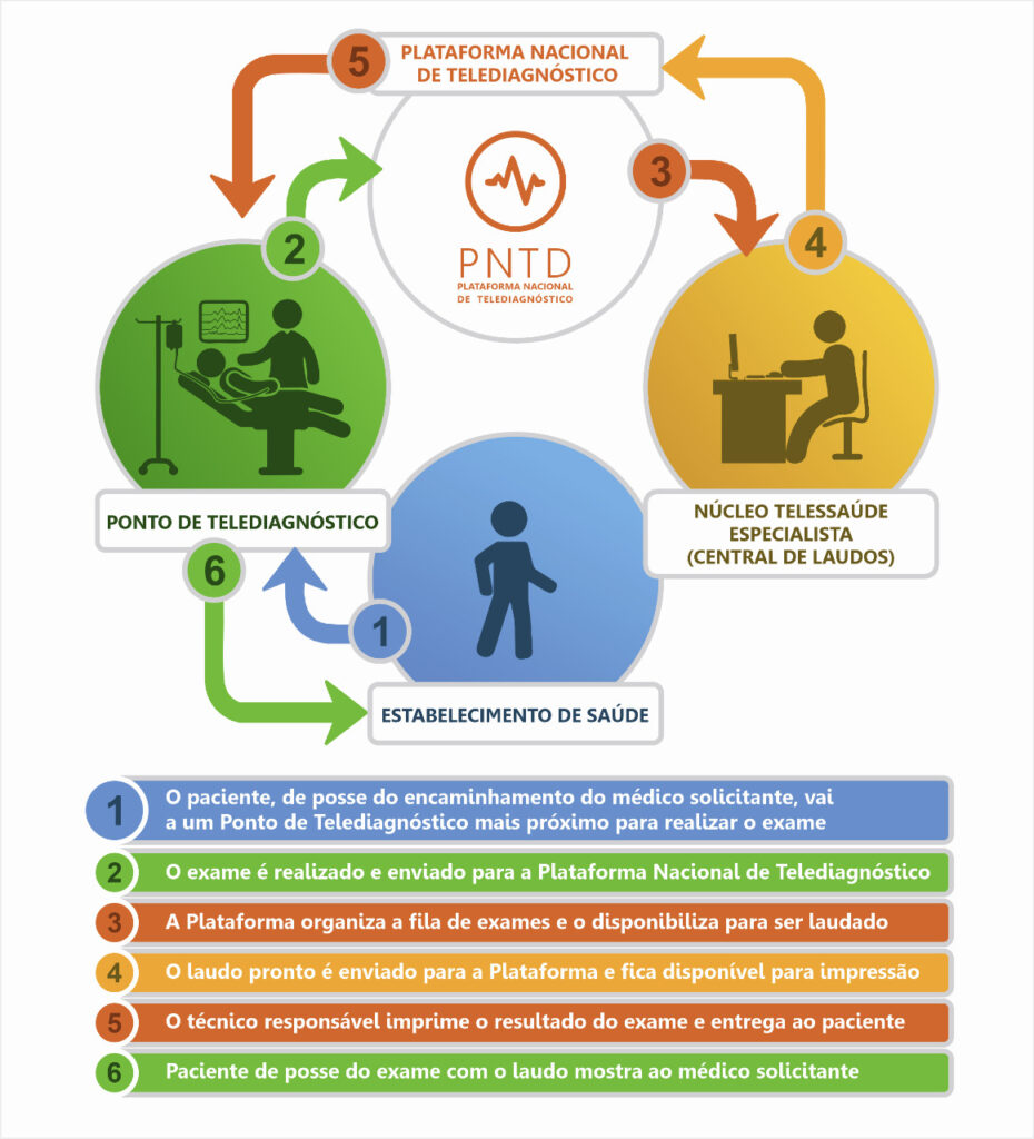O Médico solicita o Telediagnóstico em Dermatologia e encaminha o paciente para Unidade de Saúde cadastrada como Ponto de Telediagnóstico onde é realizado o registro fotográfico. Posteriormente, tal registro é enviado juntamente às informações clínicas do paciente via plataforma para o Núcleo Especialista laudar.