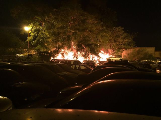 Um incêndio de grandes proporções no pátio da delegacia de Polícia Civil de Água Clara colocou em risco diversos moradores que vivem no entorno da unidade policial na noite desta sexta-feira (19).