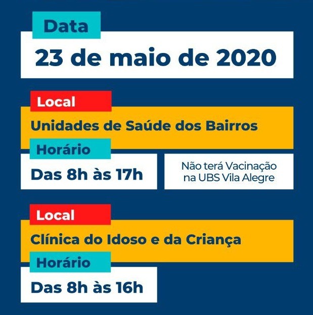 A vacinação vai ocorrer nas unidades de saúde do Município, ou seja, nos postinhos dos bairros e também na Clínica da Criança. O horário de atendimento será das 8h às 17h.