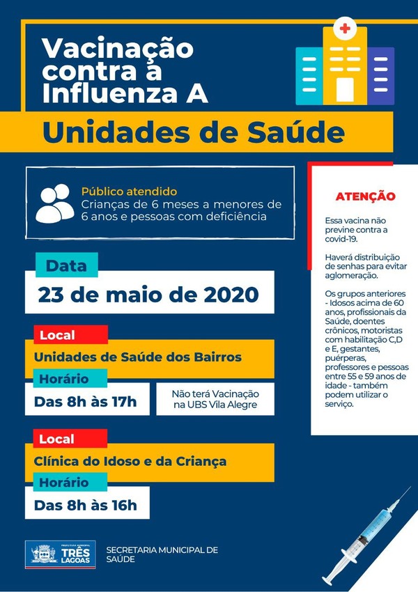 TRÊS LAGOAS (MS) – A Secretaria Municipal de Saúde de Três Lagoas (MS), realiza neste sábado (23), a terceira etapa de vacinação contra a gripe Influenza A no município. O programa de imunização da população local segue as diretrizes da Campanha Nacional de Vacinação contra a gripe Influenza A (H1N1), sendo cada etapa direcionada a um público alvo. E neste sábado, será a vez das crianças, de 6 meses a 6 anos e também das pessoas com deficiência (PCD).